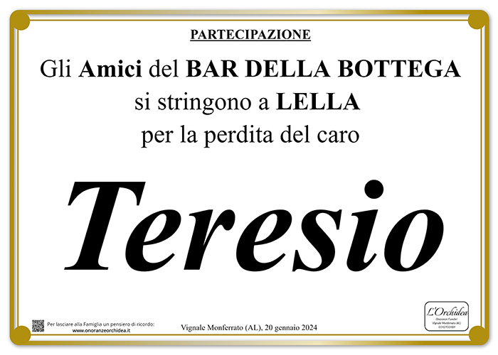 Teresio è stato parte della nostra vita, più di un amico. Lo abbiamo accompagnato col cuore nel suo ultimo doloroso calvario, soffrendo con lui e con la sua famiglia. Che la sua terra ora gli sia lieve. Un grande abbraccio da Roberto, Maria Rosa e Paolo Giorcelli.